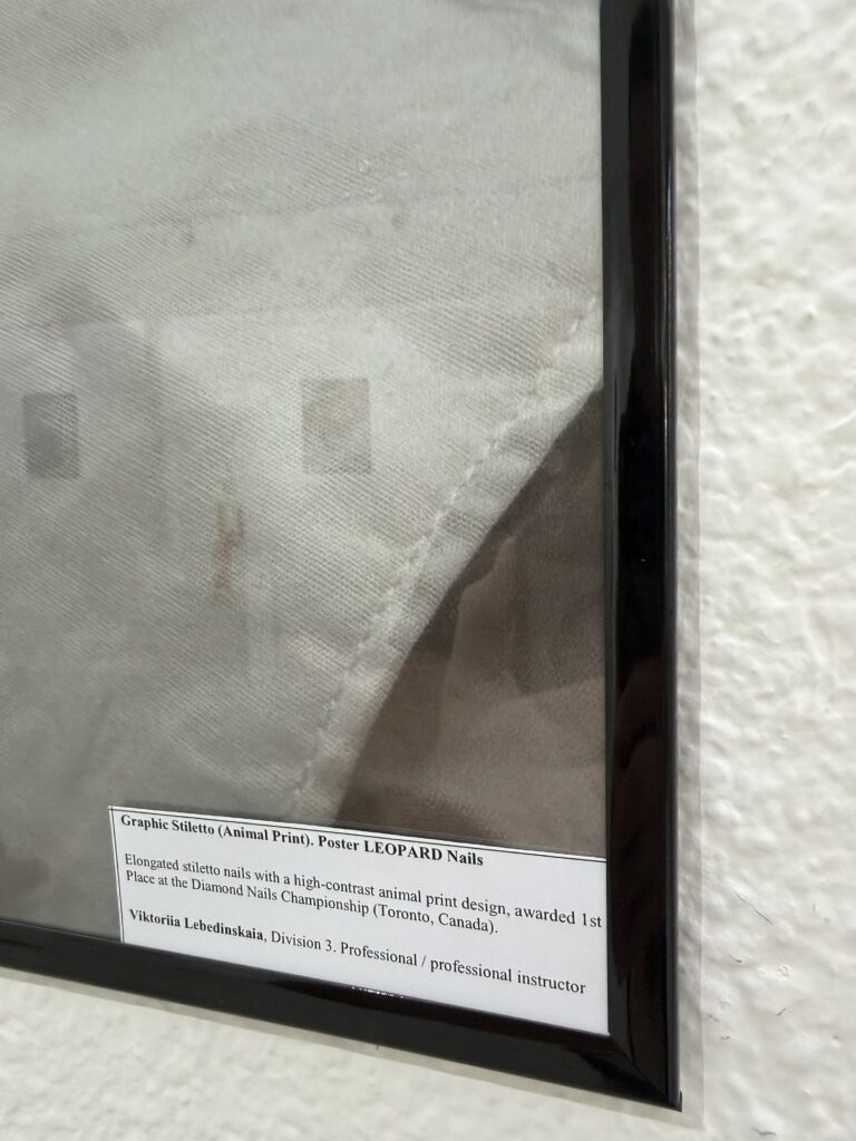 The exhibition featured high-resolution photographic works documenting nail designs previously recognized at major international professional championships, including the Brilliant Beauty World Cup, Global Talent Beauty Cup, and Diamond Nails Championship. Shown within a gallery environment, the works emphasized technical architecture, symmetry, proportional balance, and precision—core evaluation criteria in competitive nail art.
